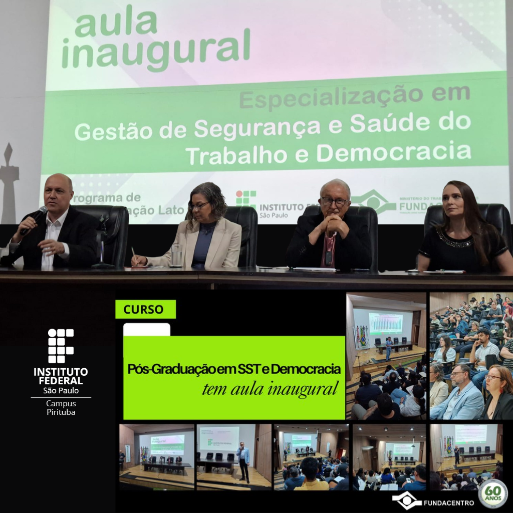 No dia 30 de janeiro (sexta-feira), foi realizada a aula magna da primeira turma do novo curso de pós-graduação lato sensu em Gestão de Segurança e Saúde do Trabalho e Democracia, vinculado ao Campus São Paulo Pirituba do Instituto Federal de São Paulo (IFSP). A iniciativa é fruto de uma parceria construída entre o IFSP e a Fundação Jorge Duprat Figueiredo de Segurança e Medicina do Trabalho (Fundacentro).