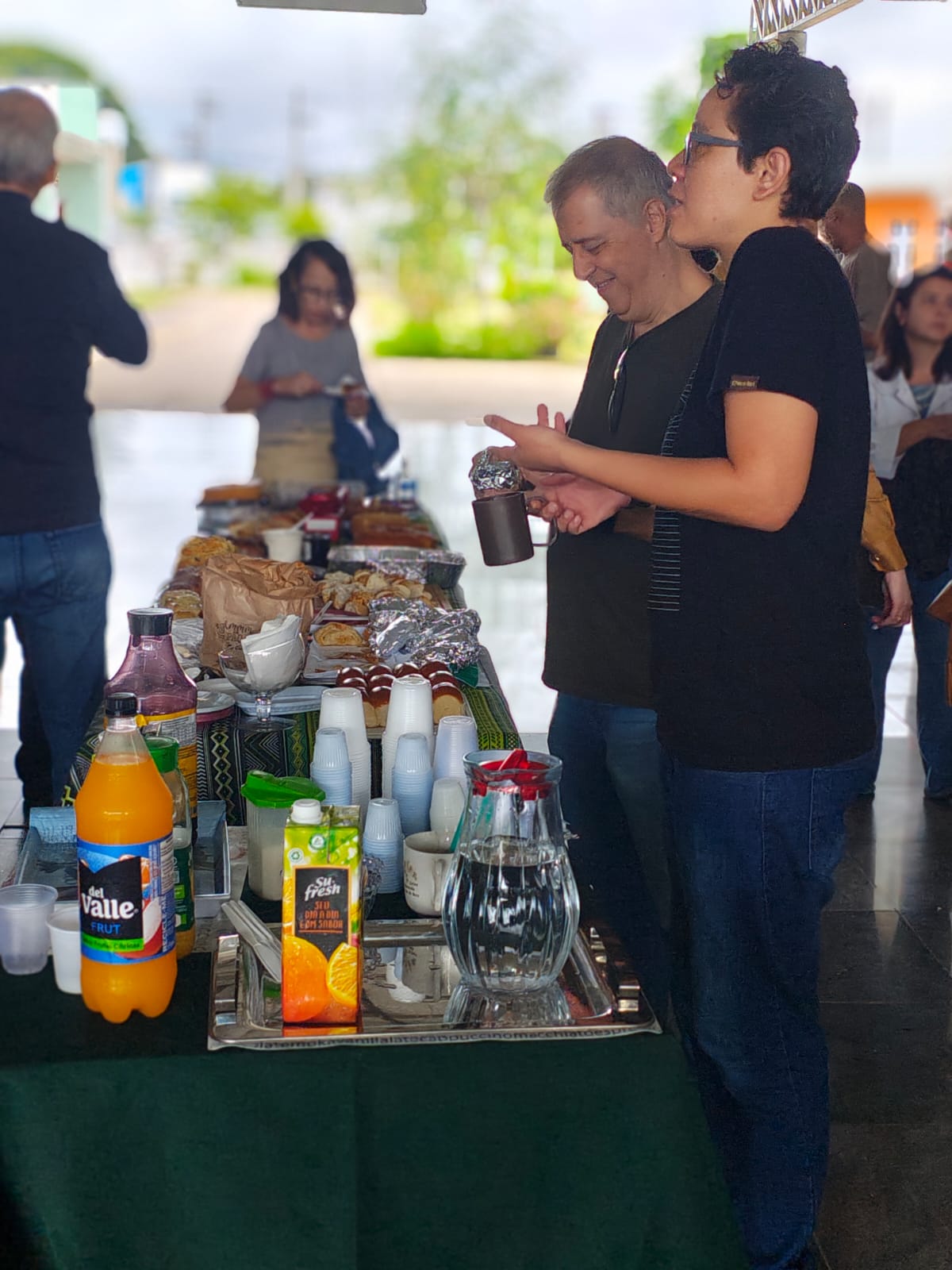 As atividades tiveram início às 9h, com um café da manhã coletivo no pátio do campus, proporcionando um momento de bate-papo, convivência e muitas delícias gastronômicas. A iniciativa contou com a colaboração voluntária dos participantes, que compartilharam alimentos e bebidas.