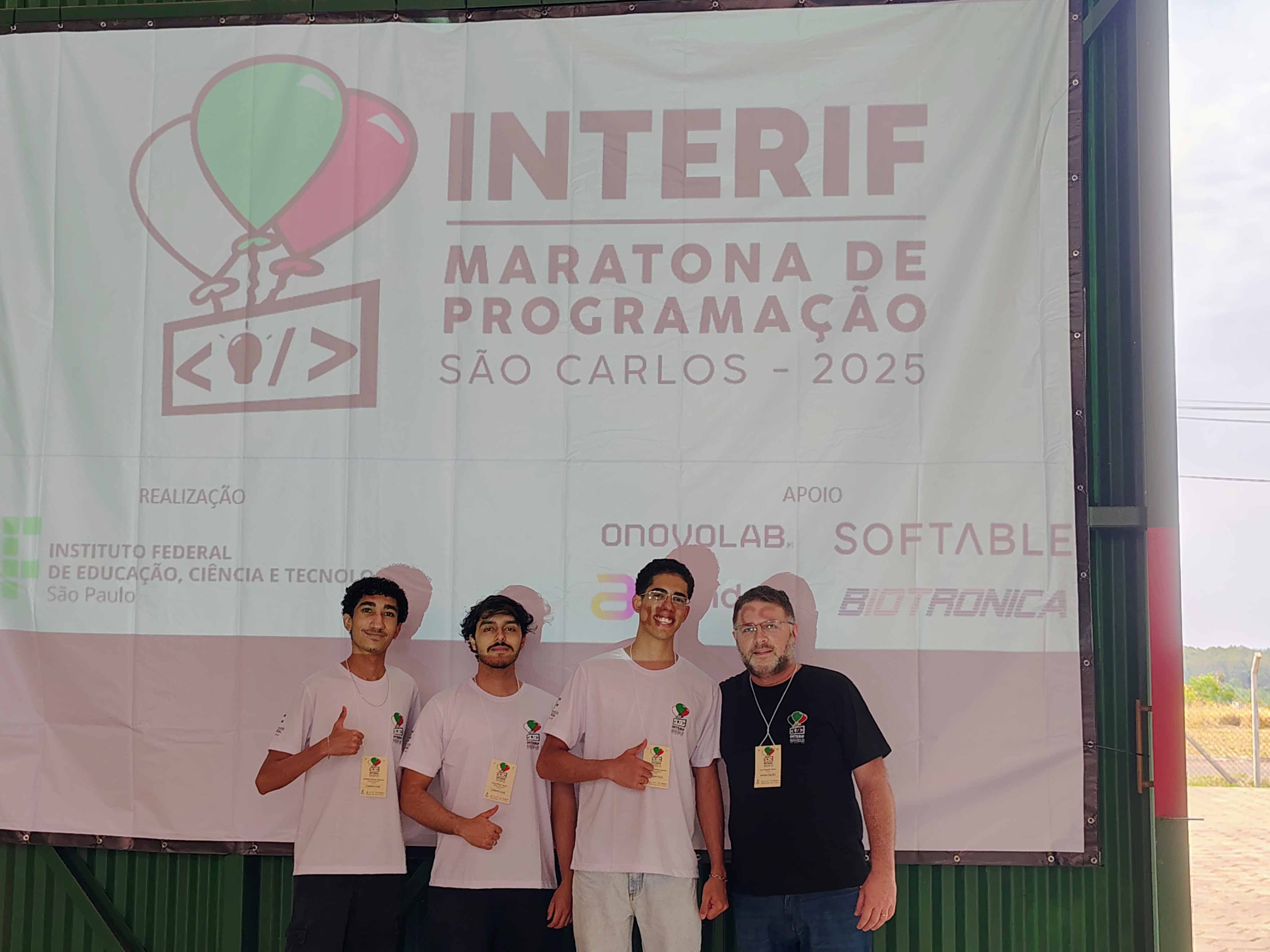 Acompanhados pelo professor e coordenador do curso de Tecnologia em Análise de Sistemas (ADS) do Campus SP Pirituba do IFSP, Luiz Albano Júnior, os estudantes Cauê Weber de Souza Veras, Gustavo de Oliveira Martins e Miguel Barcellos Moreira Duarte representaram IFSP Pirituba.